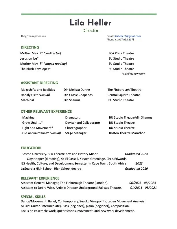 Lila is LaGuardia High School graduate, and recently also graduated from Boston University with a BFA in Theatre Arts and a minor in History. At BU they sought out directing training, while also studying performance, viewpoints, Laban technique, and choreography. With 10+ years of intensive dance training under their belt, how could movement and physical expression not be Lila’s foundation?